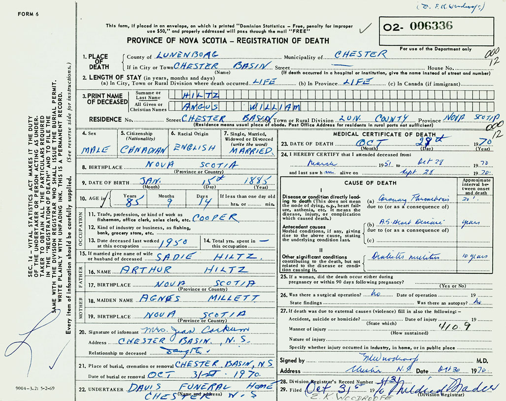 1. PLACE OF DEATH County of Lunenburg If in City or Town Chester Basin