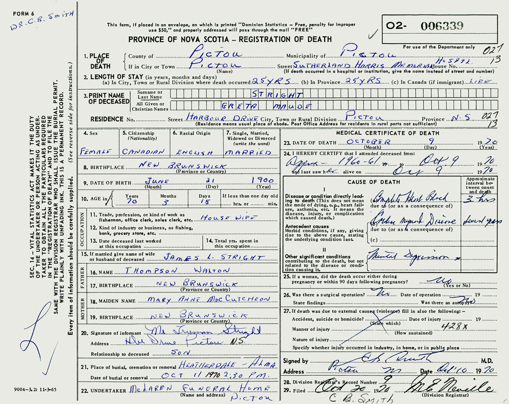 PROVINCE OF NOVA SCOTIA — REGISTRATION OF DEATH