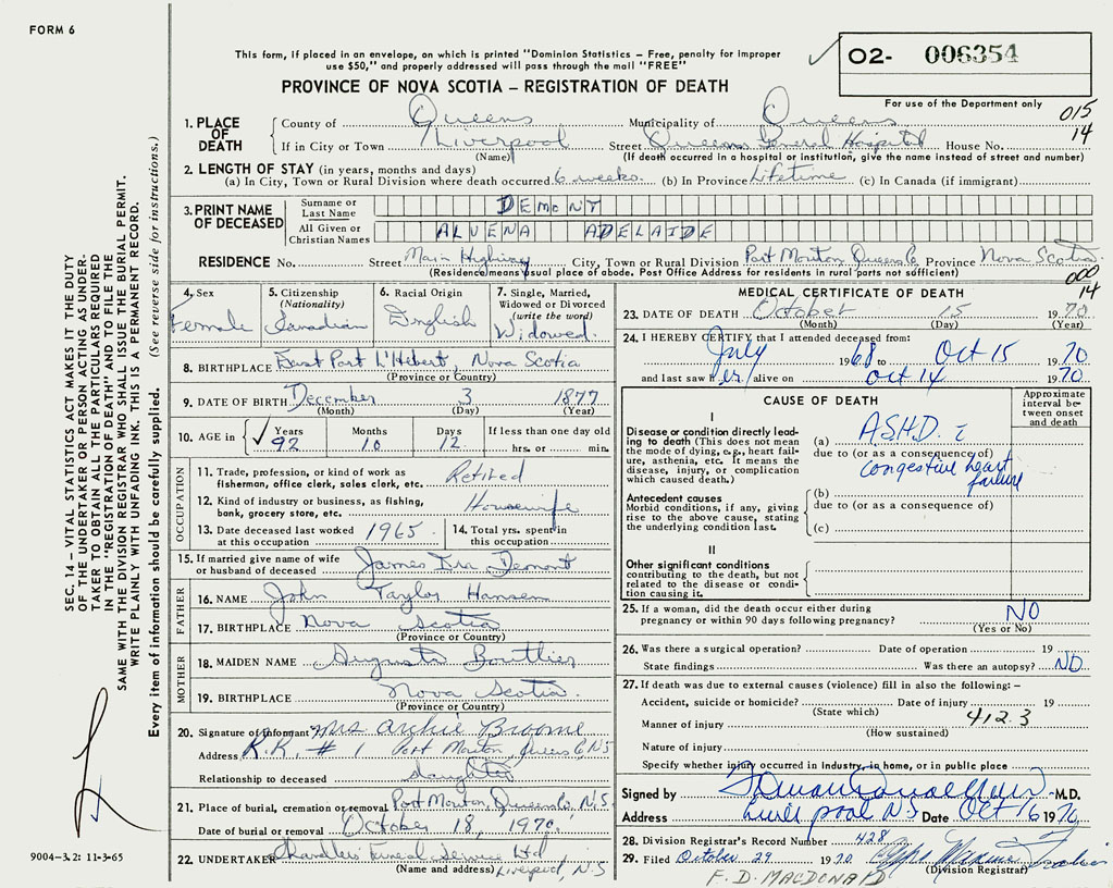 PROVINCE OF NOVA SCOTIA — REGISTRATION OF DEATH