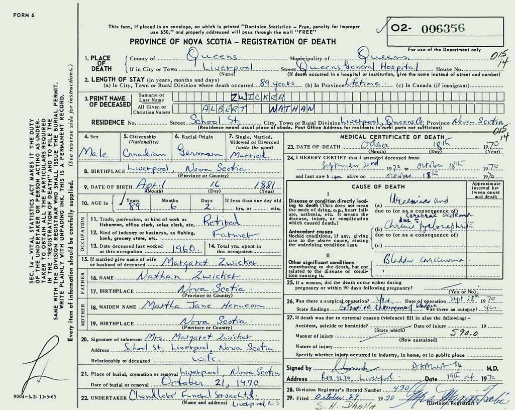 PROVINCE OF NOVA SCOTIA — REGISTRATION OF DEATH