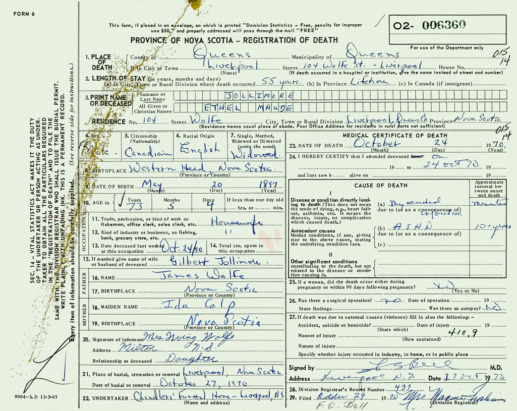 PROVINCE OF NOVA SCOTIA — REGISTRATION OF DEATH