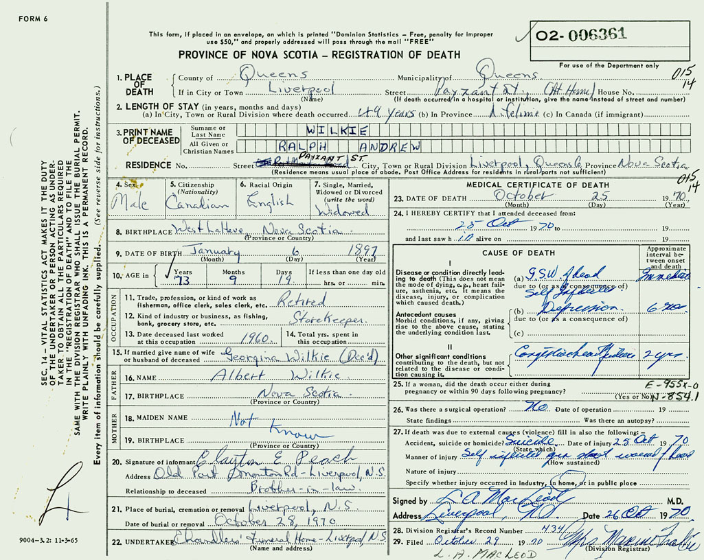 PROVINCE OF NOVA SCOTIA — REGISTRATION OF DEATH