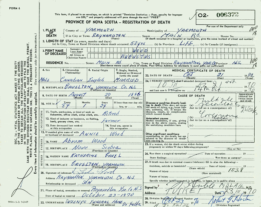 PROVINCE OF NOVA SCOTIA — REGISTRATION OF DEATH