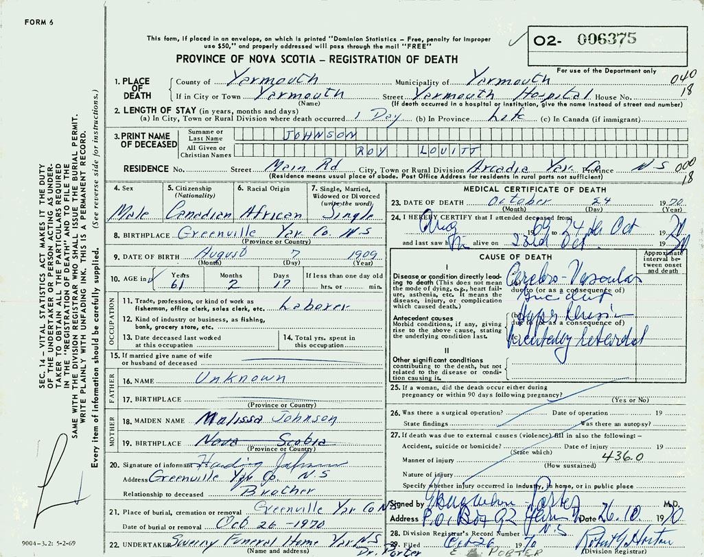 PROVINCE OF NOVA SCOTIA — REGISTRATION OF DEATH