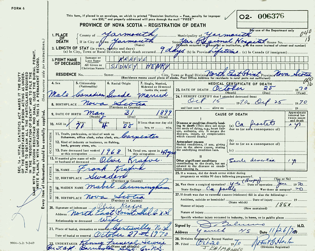 PROVINCE OF NOVA SCOTIA — REGISTRATION OF DEATH