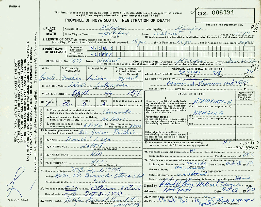 PROVINCE OF NOVA SCOTIA — REGISTRATION OF DEATH