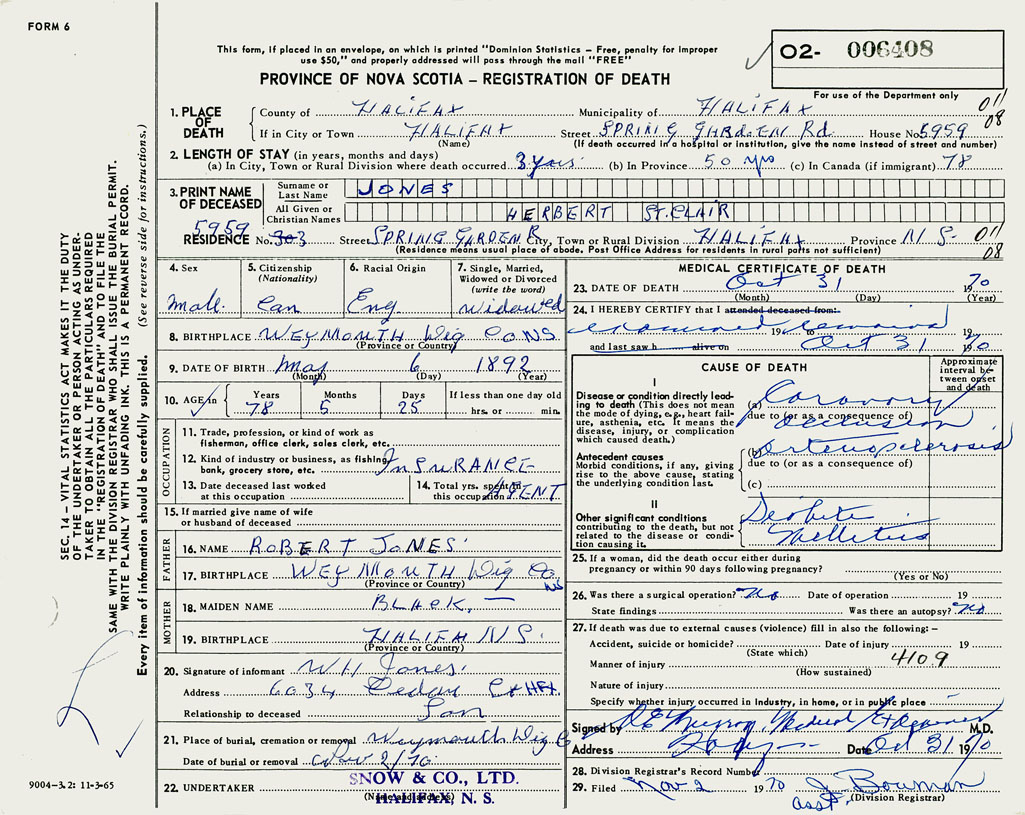 PROVINCE OF NOVA SCOTIA — REGISTRATION OF DEATH