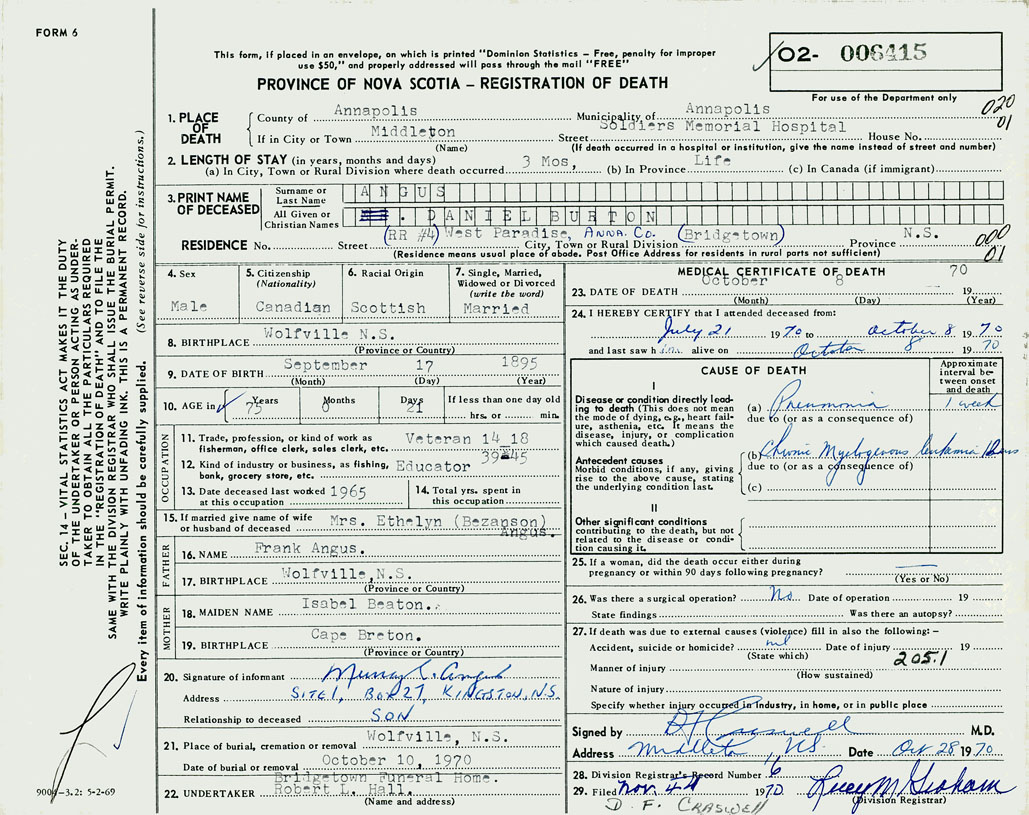 PROVINCE OF NOVA SCOTIA — REGISTRATION OF DEATH