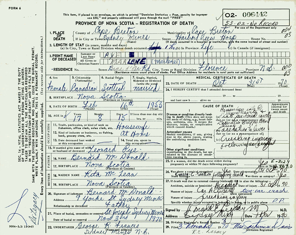 1. PLACE OF DEATH County of Cape Breton If in City or Town Sydney Mines