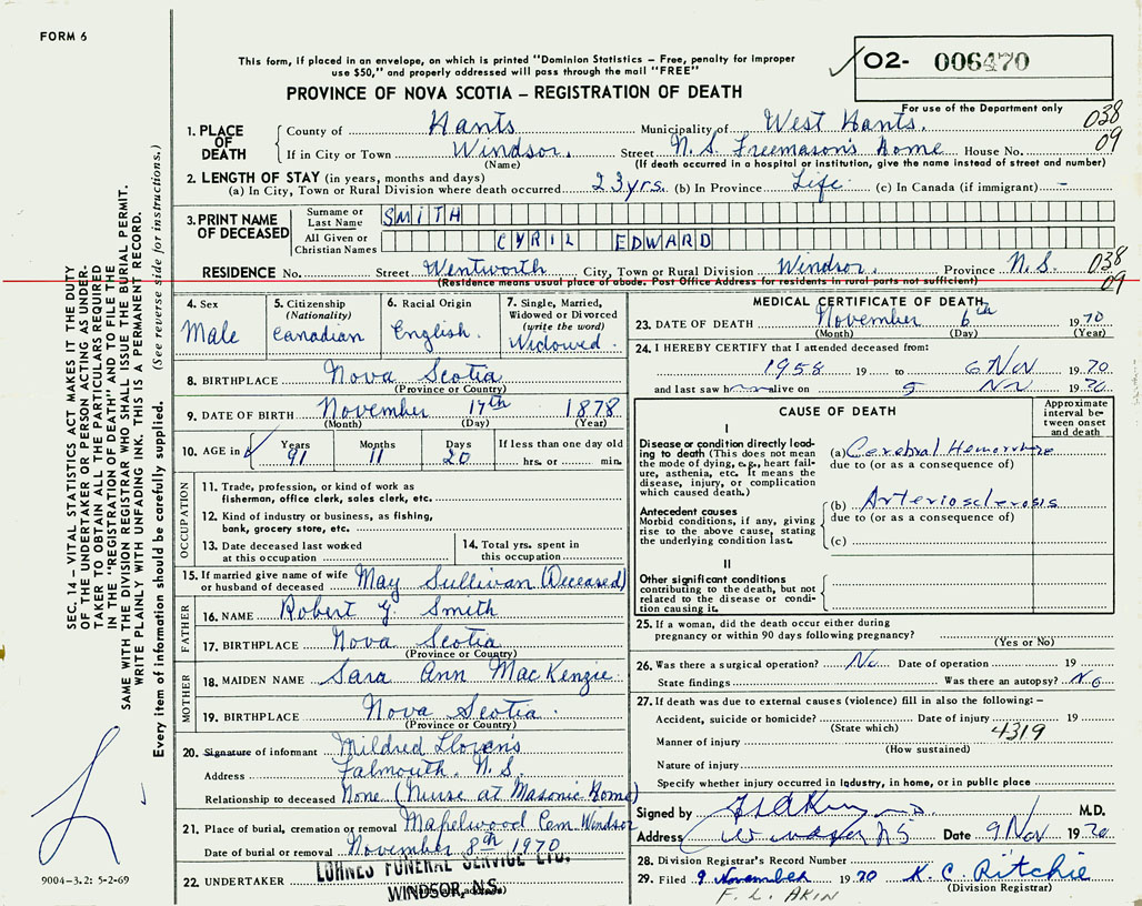 PROVINCE OF NOVA SCOTIA — REGISTRATION OF DEATH