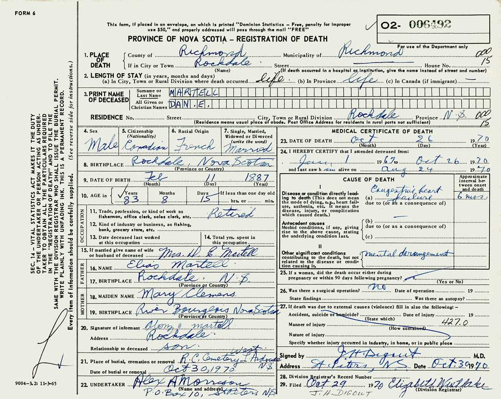 PROVINCE OF NOVA SCOTIA — REGISTRATION OF DEATH