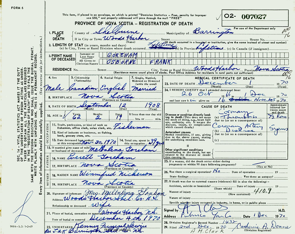 1. PLACE OF DEATH County of Shelburne If in City or Town Woods Harbour