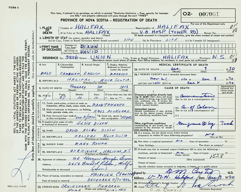 PROVINCE OF NOVA SCOTIA — REGISTRATION OF DEATH