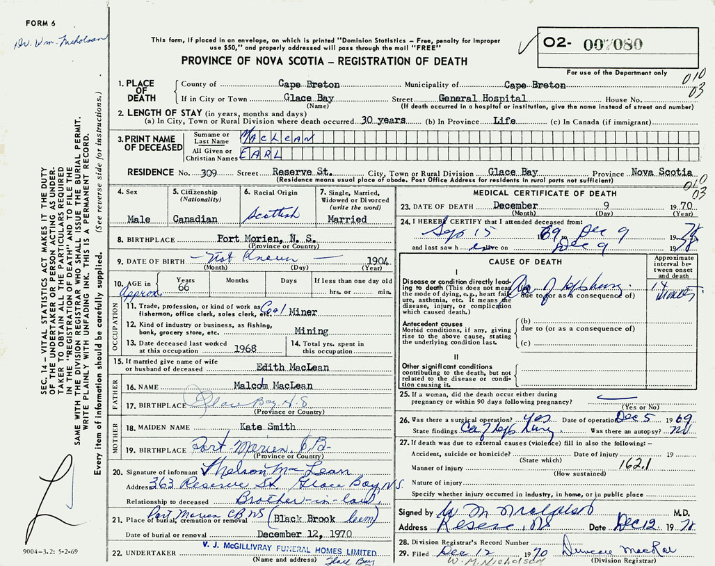 1. PLACE OF DEATH County of Cape Breton If in City or Town Glace Bay