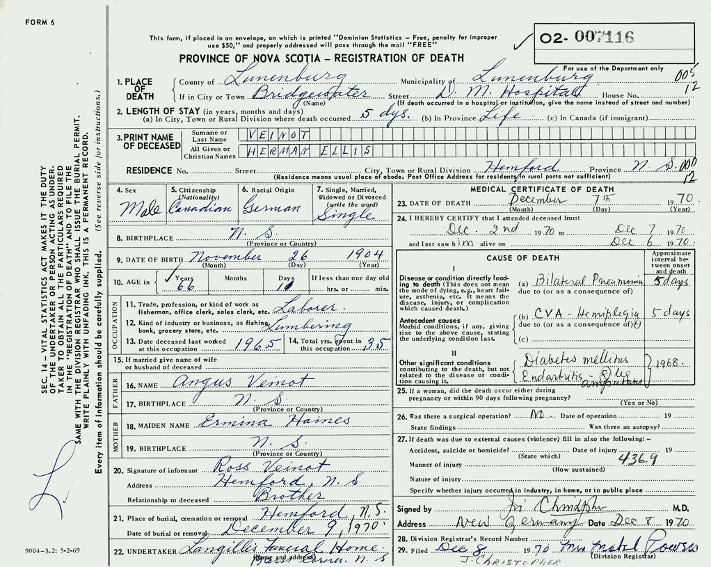 3. PRINT NAME OF DECEASED Veinot, Herman Ellis