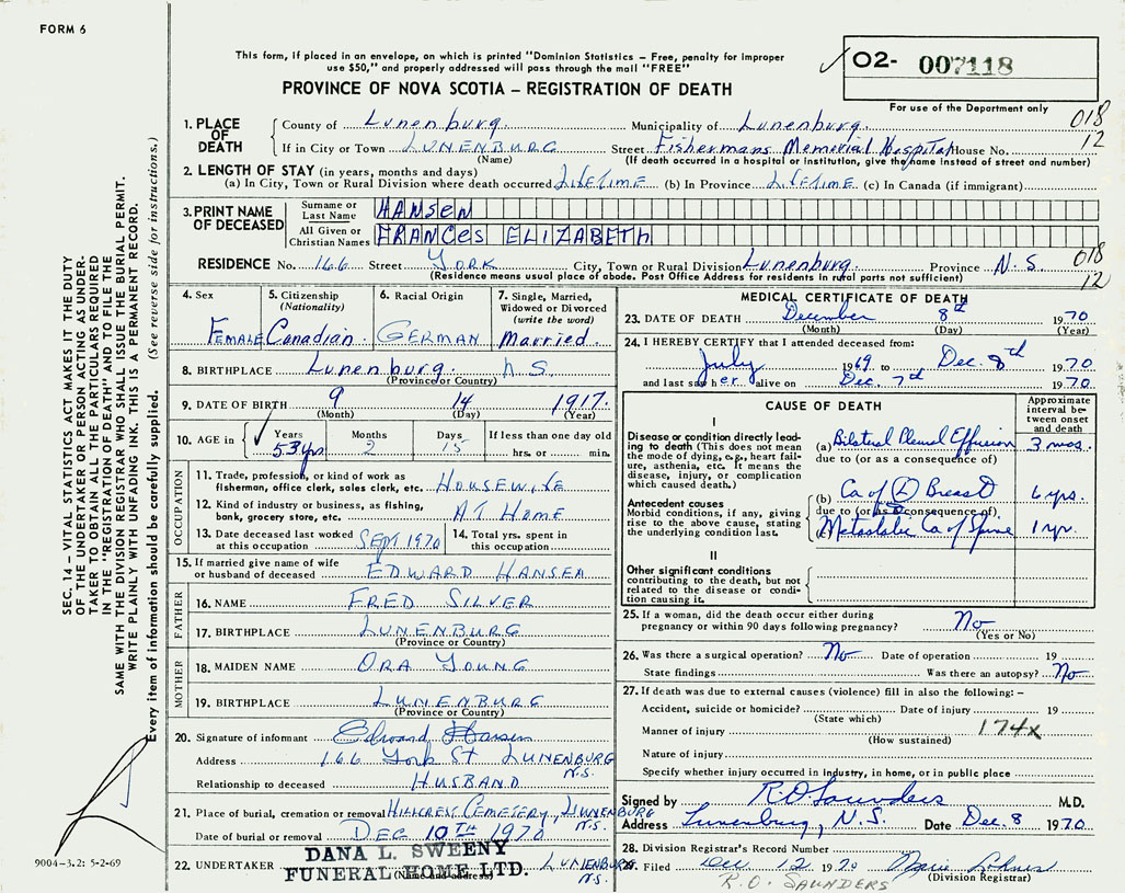 21. Place of burial Hillcrest Cemetery, Lunenburg