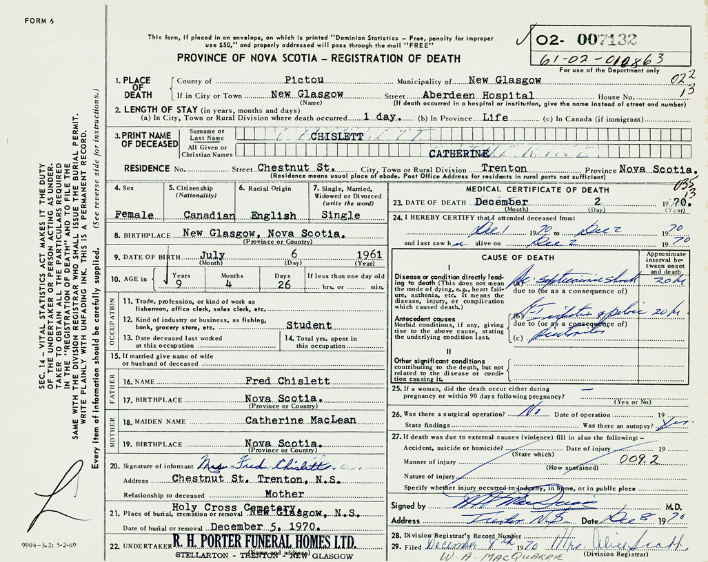 1. PLACE OF DEATH County of Pictou If in City or Town New Glasgow