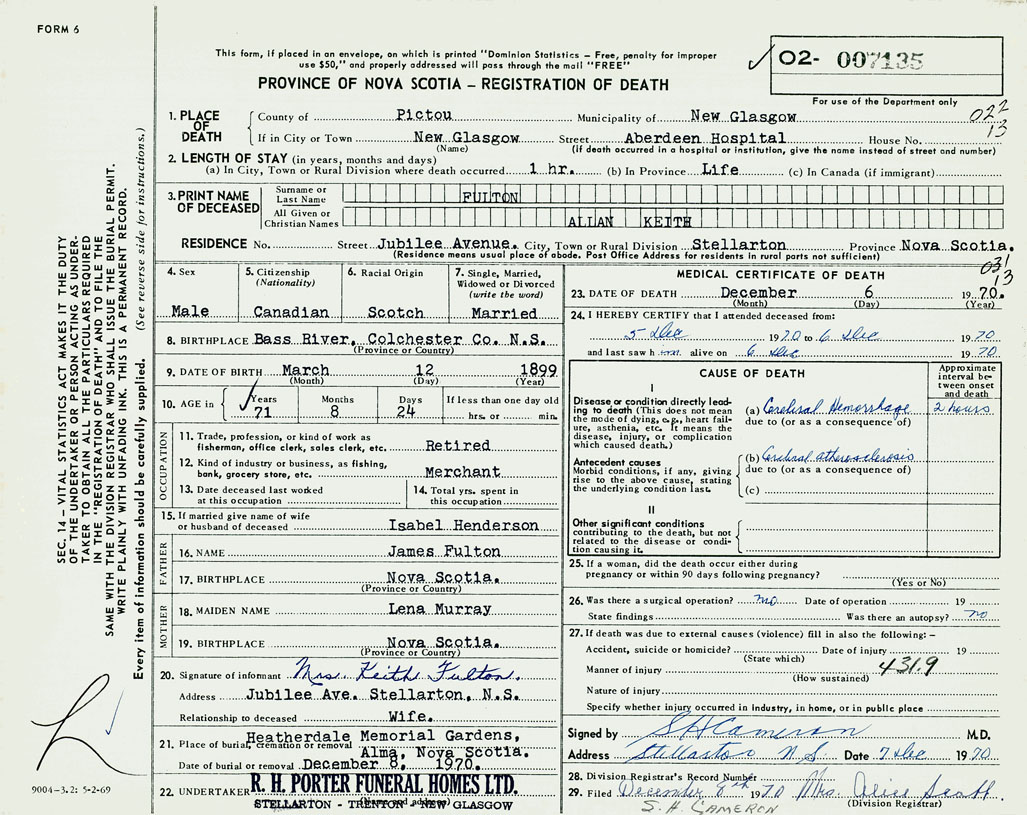 PROVINCE OF NOVA SCOTIA — REGISTRATION OF DEATH