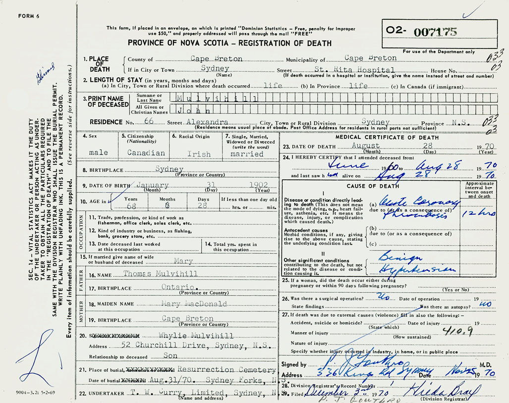 1. PLACE OF DEATH County of Cape Breton If in City or Town Sydney