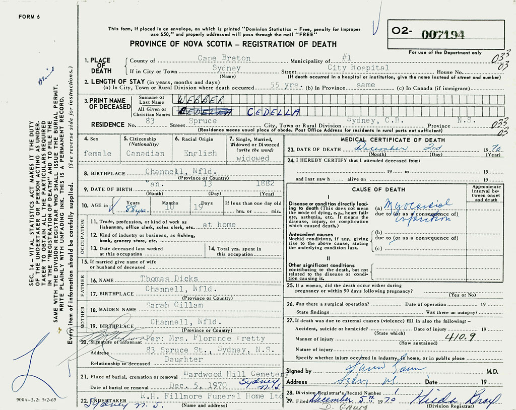 1. PLACE OF DEATH County of Cape Breton If in City or Town Sydney