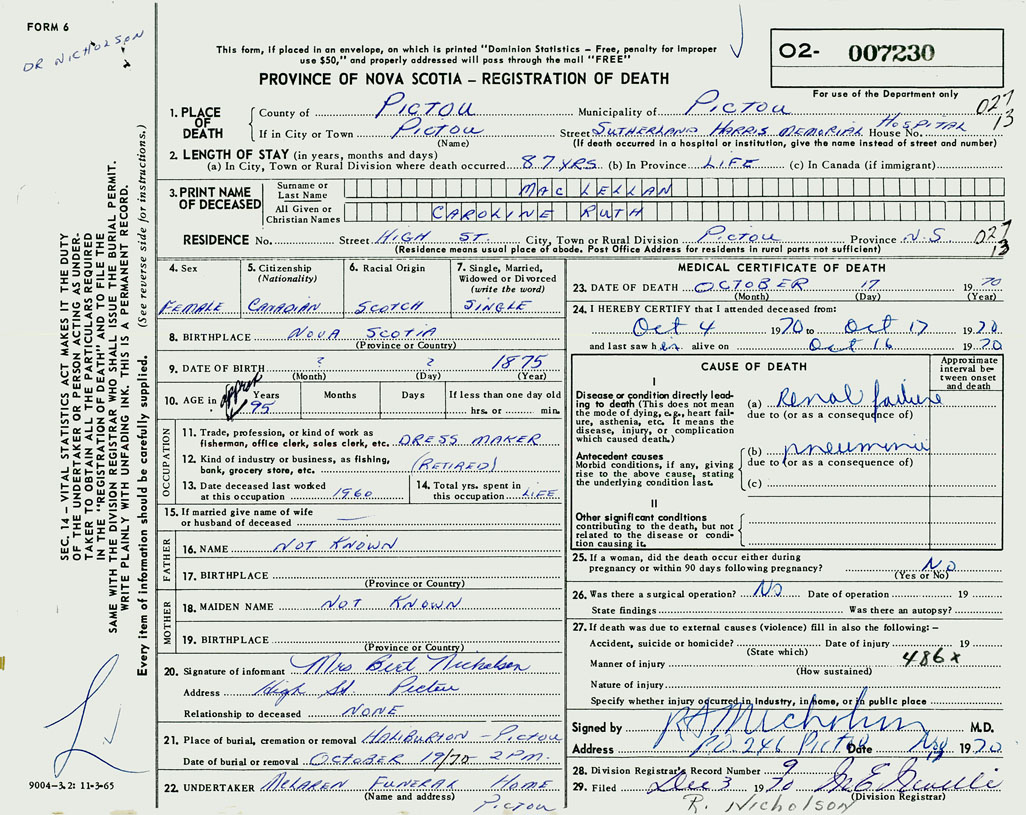 1. PLACE OF DEATH County of Pictou If in City or Town Pictou