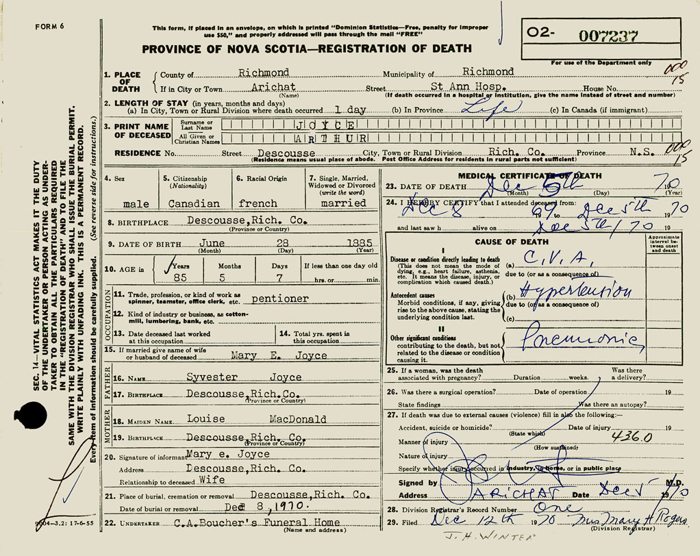 1. PLACE OF DEATH County of Richmond If in City or Town Arichat