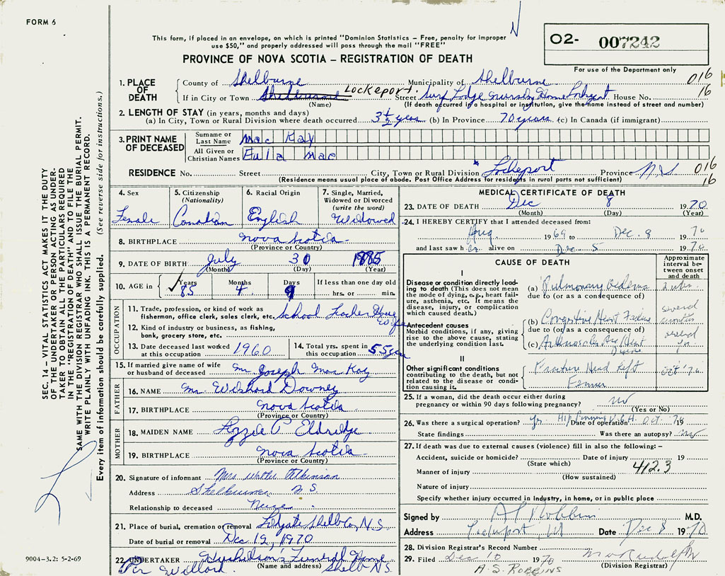 1. PLACE OF DEATH County of Shelburne If in City or Town Lockeport
