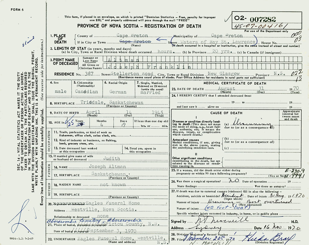 PROVINCE OF NOVA SCOTIA — REGISTRATION OF DEATH