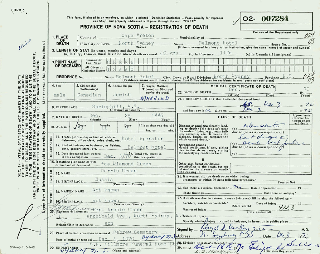 1. PLACE OF DEATH County of Cape Breton If in City or Town North Sydney