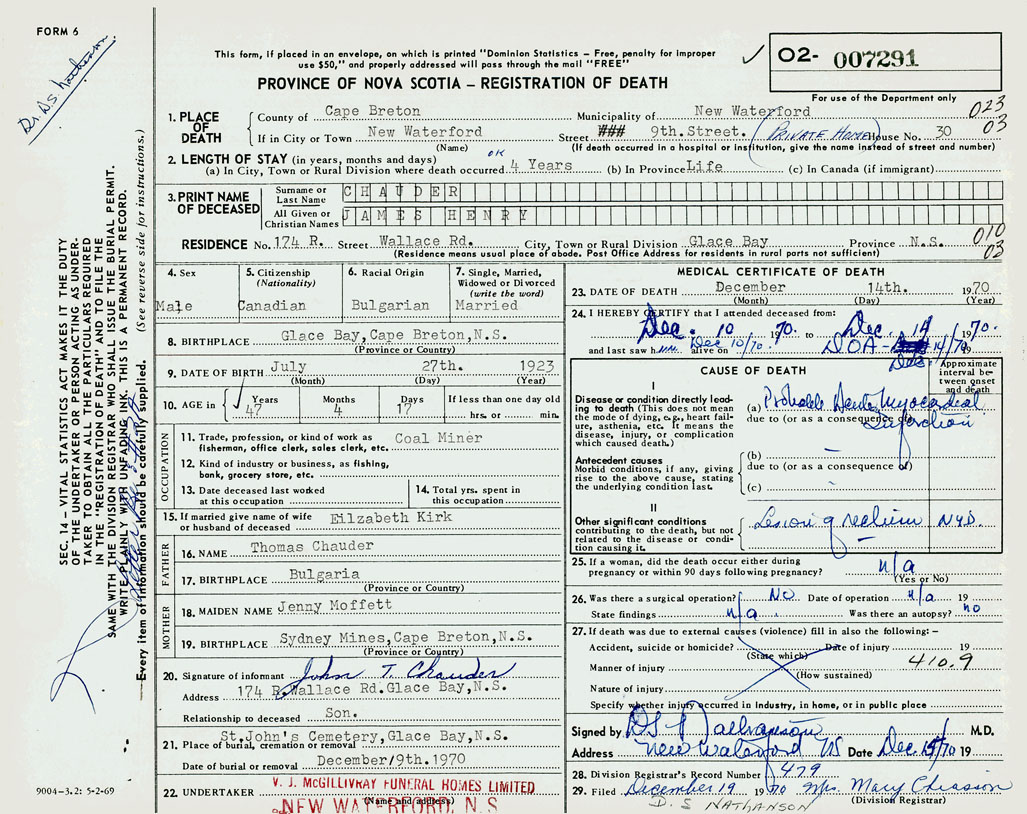 1. PLACE OF DEATH County of Cape Breton If in City or Town 30 9th. Street, New Waterford