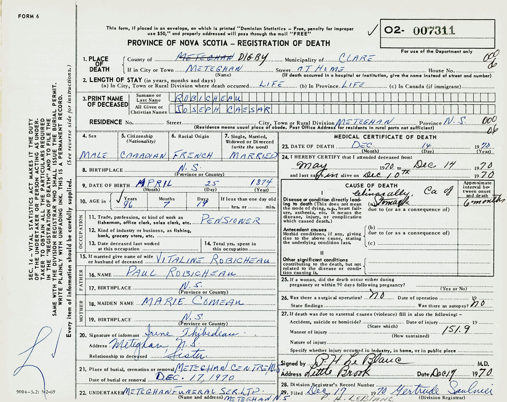1. PLACE OF DEATH County of Digby If in City or Town Meteghan