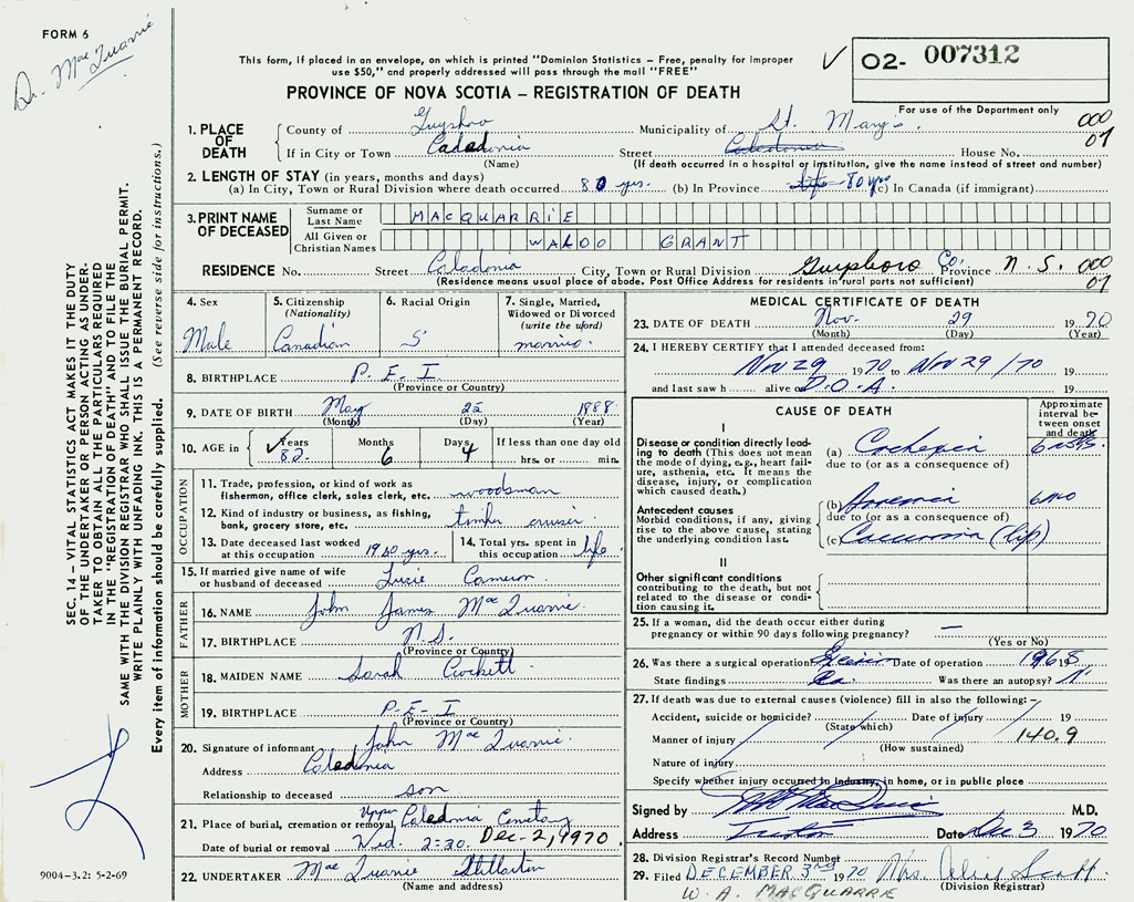 PROVINCE OF NOVA SCOTIA — REGISTRATION OF DEATH