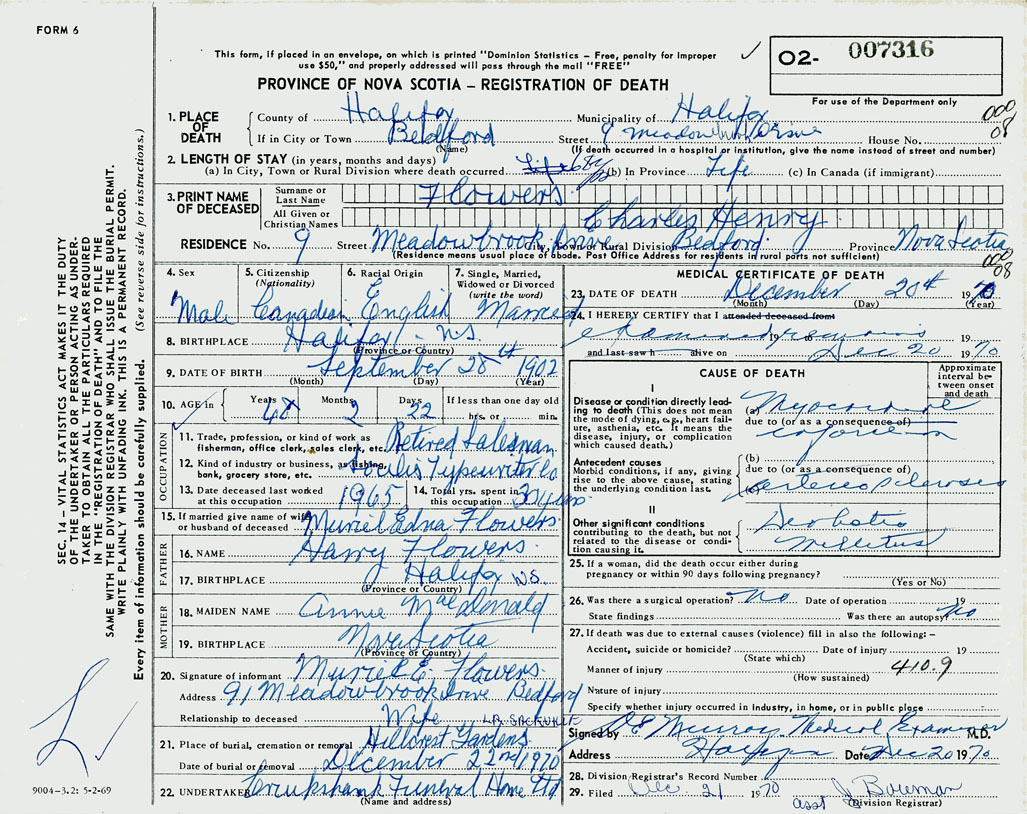 PROVINCE OF NOVA SCOTIA — REGISTRATION OF DEATH