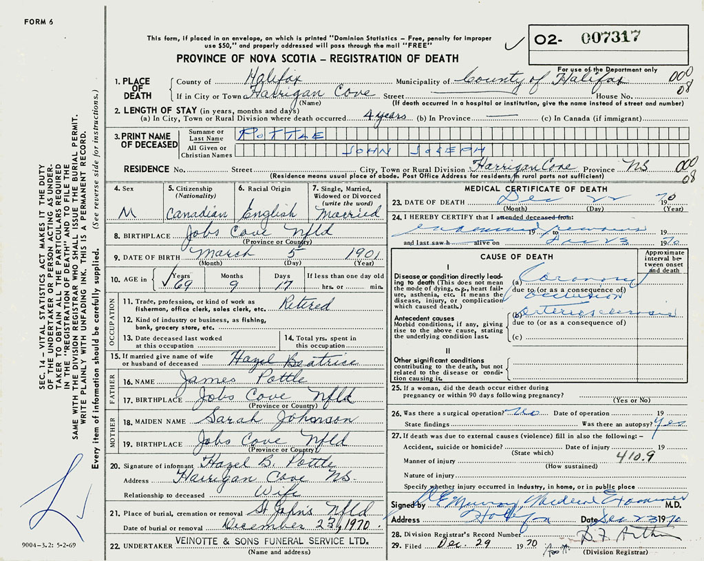 1. PLACE OF DEATH County of Halifax If in City or Town Harrigan Cove