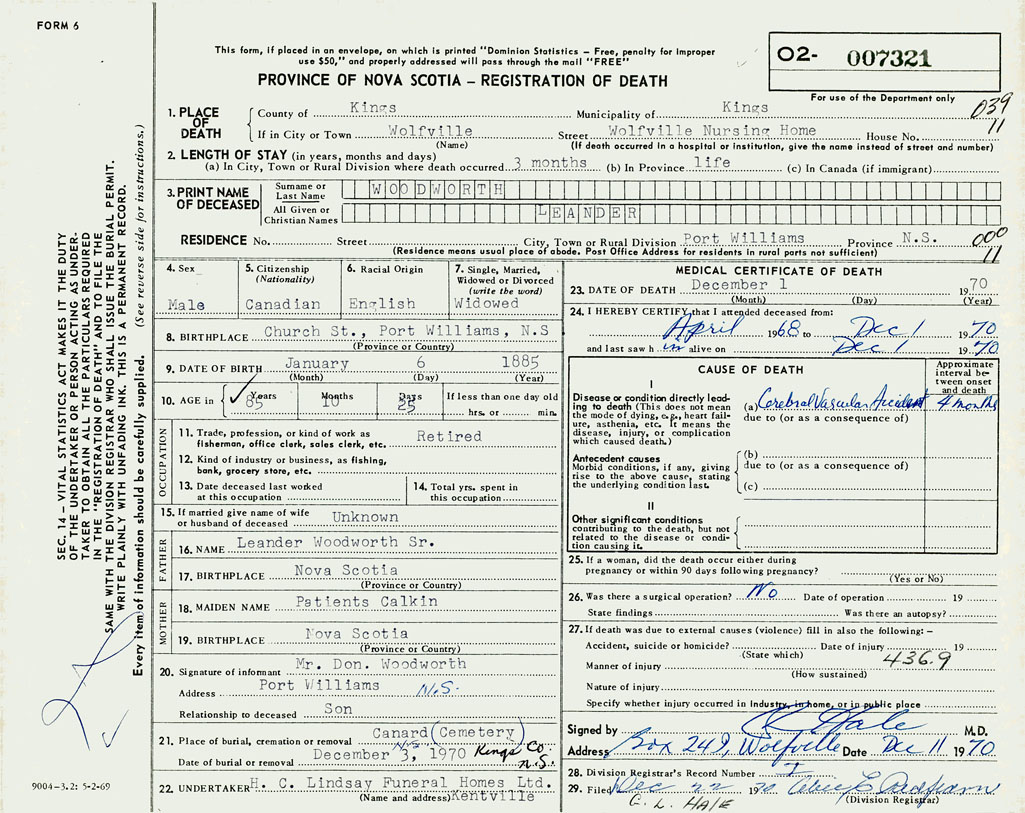 PROVINCE OF NOVA SCOTIA — REGISTRATION OF DEATH
