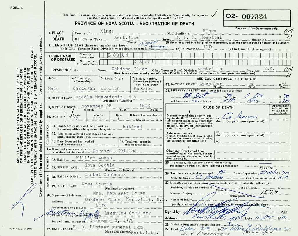 PROVINCE OF NOVA SCOTIA — REGISTRATION OF DEATH