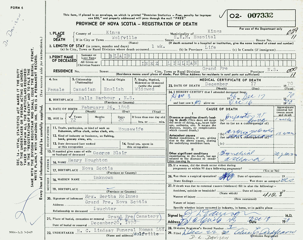 PROVINCE OF NOVA SCOTIA — REGISTRATION OF DEATH