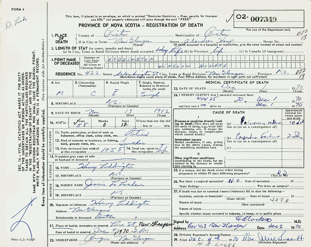 PROVINCE OF NOVA SCOTIA — REGISTRATION OF DEATH