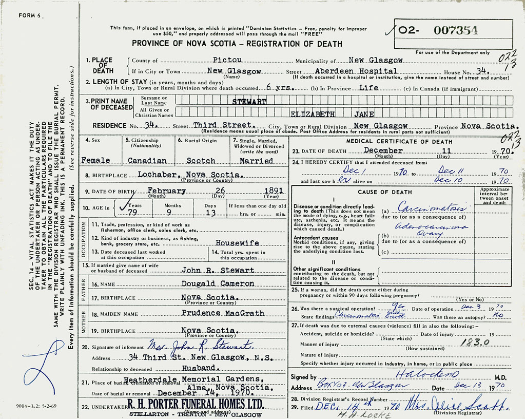 PROVINCE OF NOVA SCOTIA — REGISTRATION OF DEATH