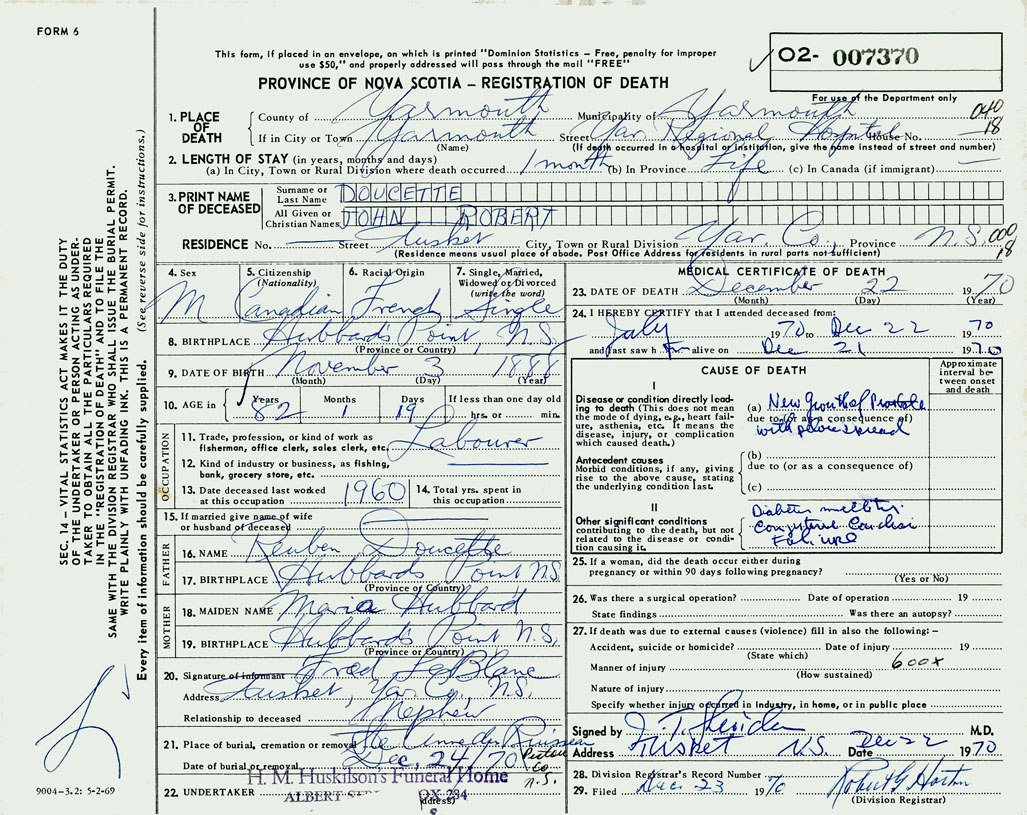 PROVINCE OF NOVA SCOTIA — REGISTRATION OF DEATH
