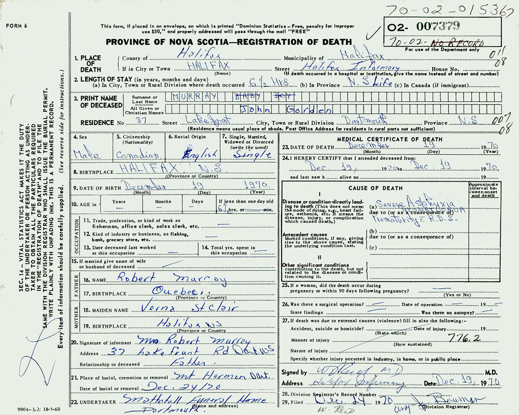 PROVINCE OF NOVA SCOTIA — REGISTRATION OF DEATH
