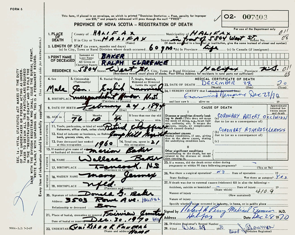 PROVINCE OF NOVA SCOTIA — REGISTRATION OF DEATH