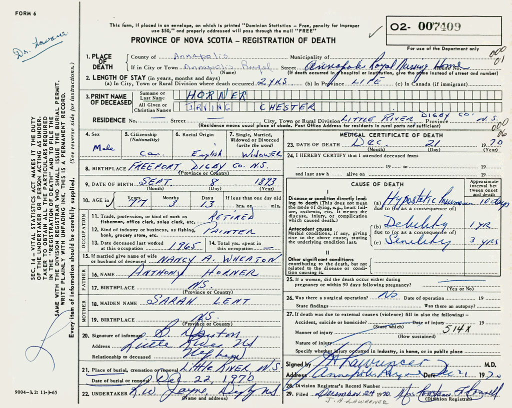 1. PLACE OF DEATH County of Annapolis If in City or Town Annapolis Royal