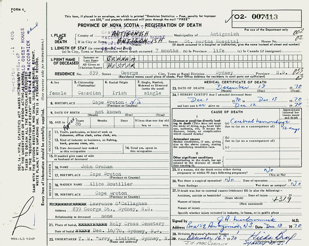 1. PLACE OF DEATH County of Antigonish If in City or Town Antigonish