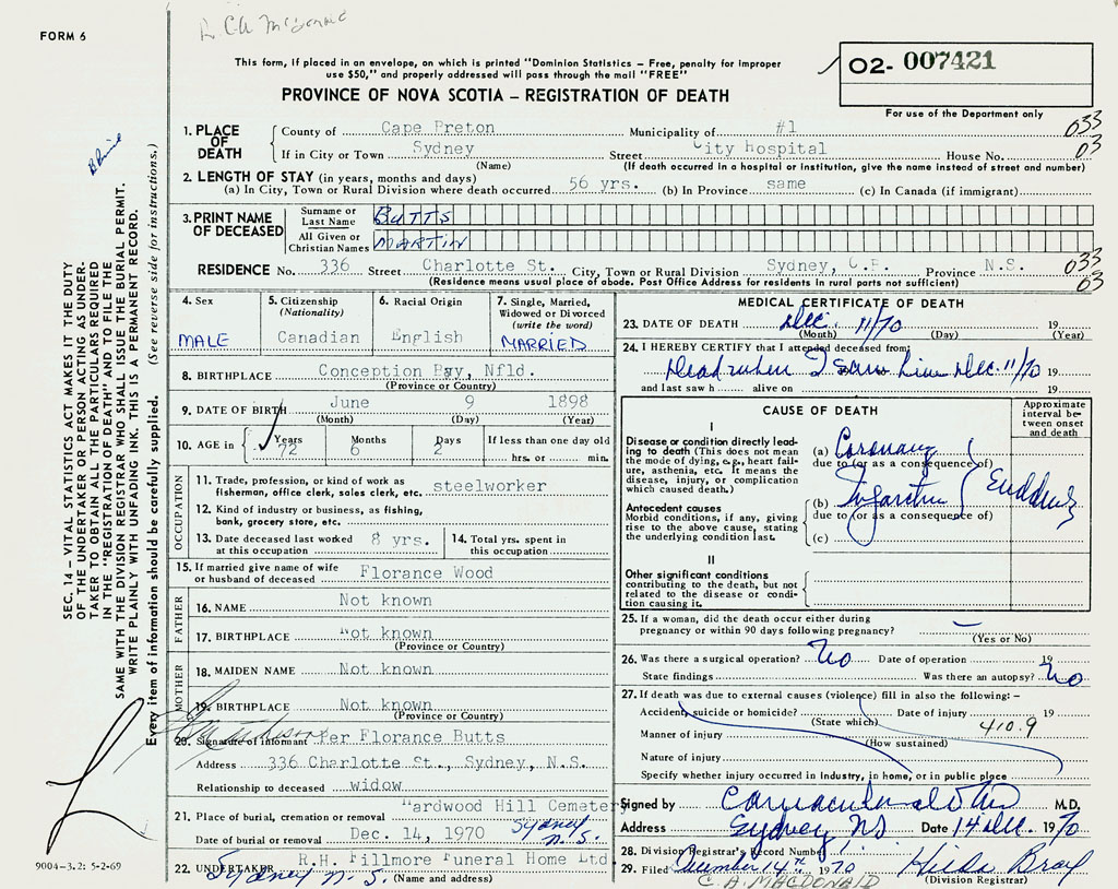 1. PLACE OF DEATH County of Cape Breton If in City or Town Sydney