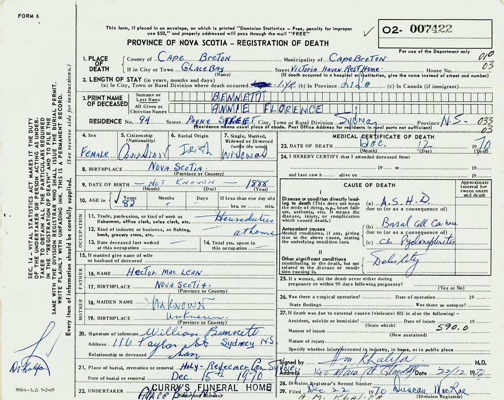 1. PLACE OF DEATH County of Cape Breton If in City or Town Glace Bay