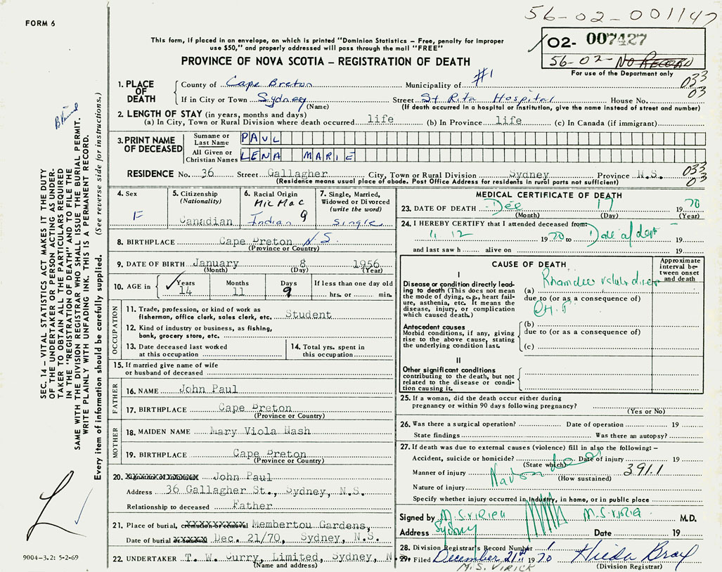 PROVINCE OF NOVA SCOTIA — REGISTRATION OF DEATH