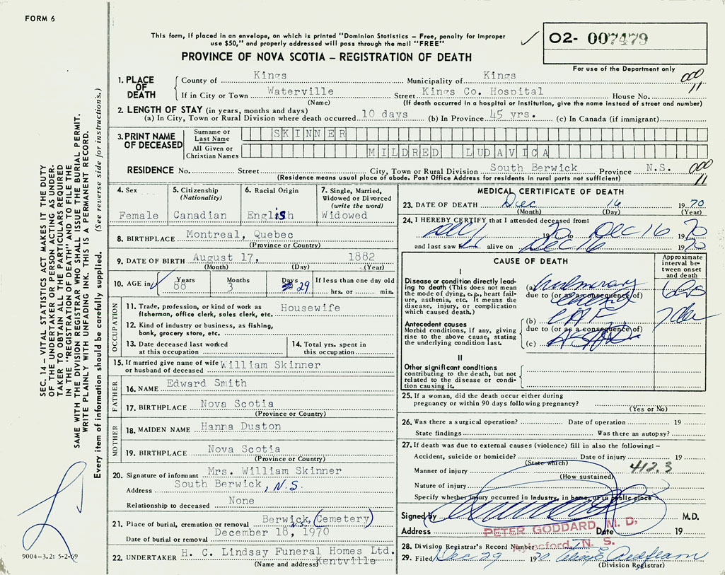 PROVINCE OF NOVA SCOTIA — REGISTRATION OF DEATH