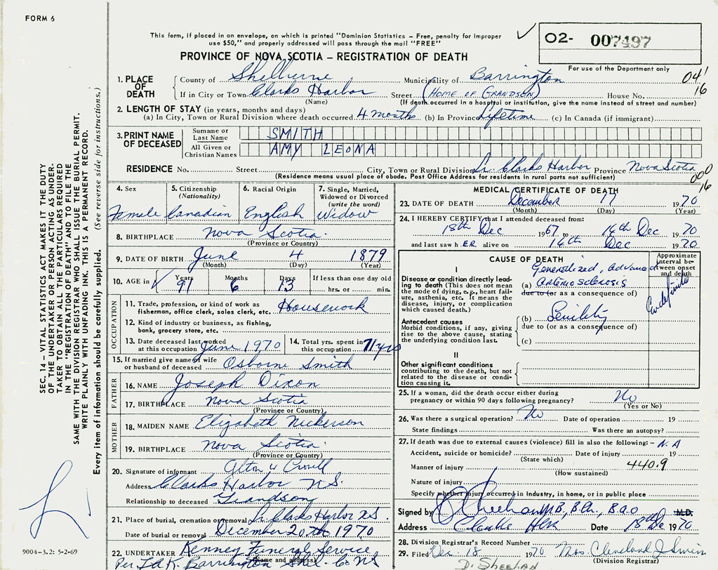 1. PLACE OF DEATH County of Shelburne If in City or Town Clarks Harbour