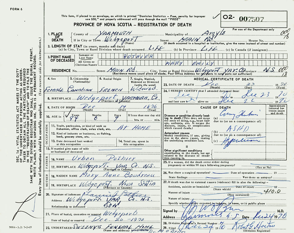 1. PLACE OF DEATH County of Yarmouth If in City or Town Wedgeport